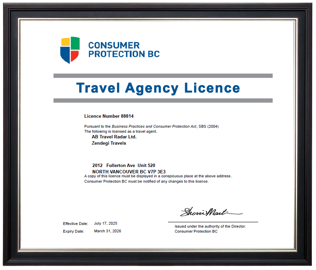 با اطمینان خاطر سفر خود را با تراول رادر رزرو کنید. ما با افتخار دارای مجوز رسمی از سازمان حمایت از مصرفکنندگان بریتیش کلمبیا به شماره ۸۸۸۱۴ هستیم.
